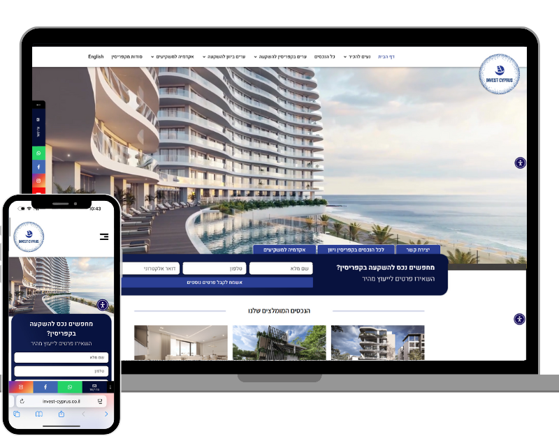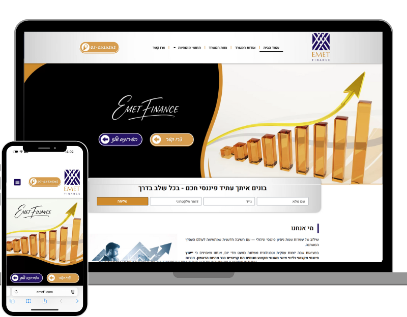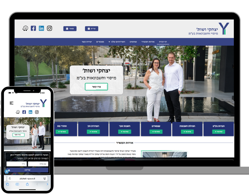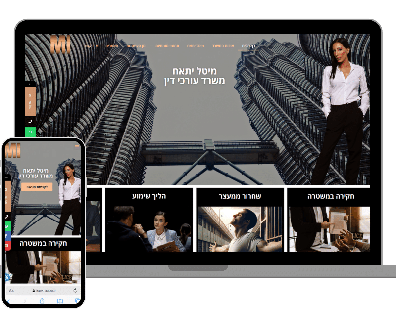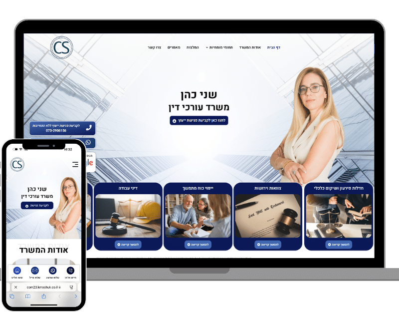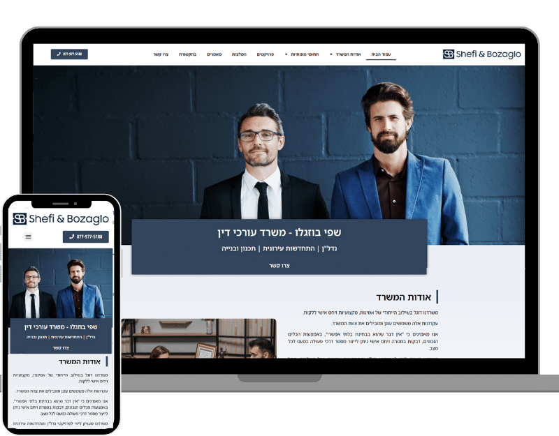 האתר מעוצב על גבי תבנית מוכחת, מותאמת לניידים, חוויית משתמש וקריאות לפעולה. אנו מבצעים התאמות עיצוב מלאות – צבעים, אייקונים, מבנה וסידור התכנים – כך שהתוצאה תהיה אתר יוקרתי, ברור ונעים לגלישה, שמחזק את תדמית המשרד ומשדר רצינות ואמינות.